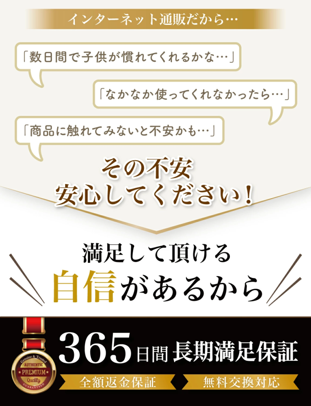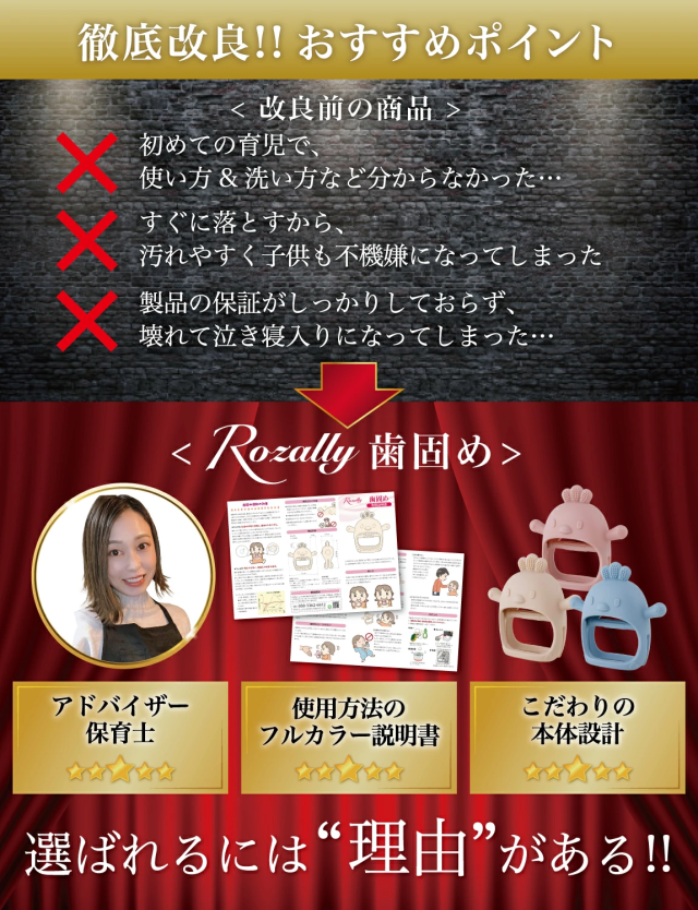 | Rozally 歯がためは品質にこだわり、工場と交渉をおこなって素材選定から進めています。 出荷前の検品などは十分に行わせて頂いているのですが、輸送中に破損や汚れの付着など稀に発生してしまうケースがあります。 不具合などが発生してしまった場合でも、製品には1年間の長期保証を付属させて頂いておりますので、すぐに交換品の手配をさせて頂きます。 また本製品には使いやすさや快適さを実感して頂くことを最優先に考え、「2週間ほどなかなか上手く使用できなかった」という場合に、”開封後”でも”使用済み”でも全額の返金保証を付属させて頂いております。 |