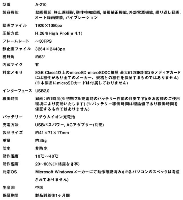 ■A-210 フルHD キーレス型カメラ 【小型カメラ】【オンスクエア】【スパイダーズX】