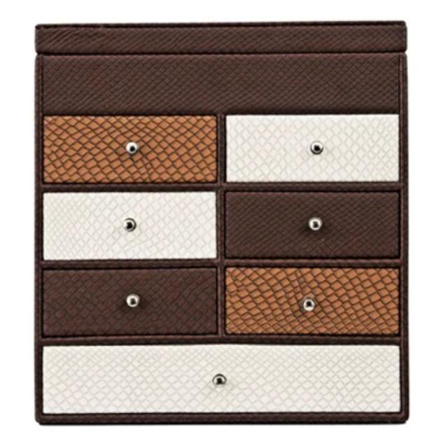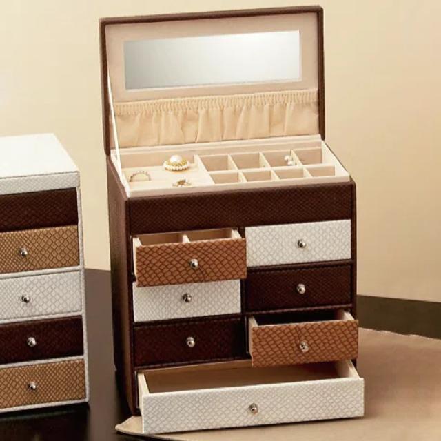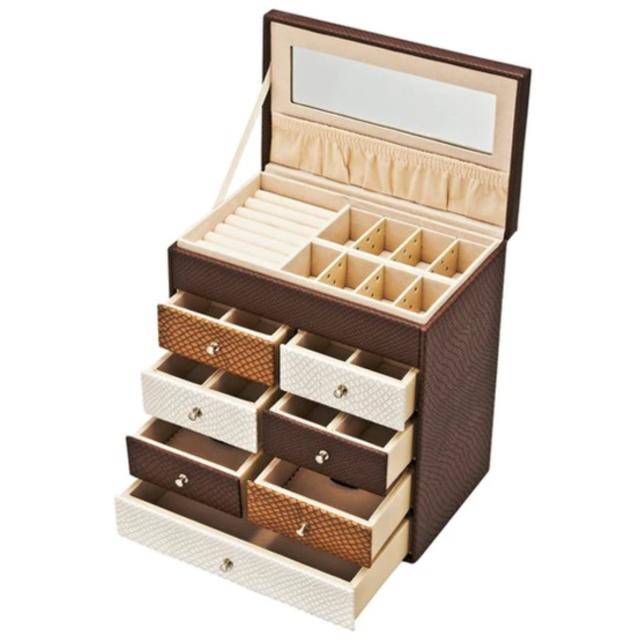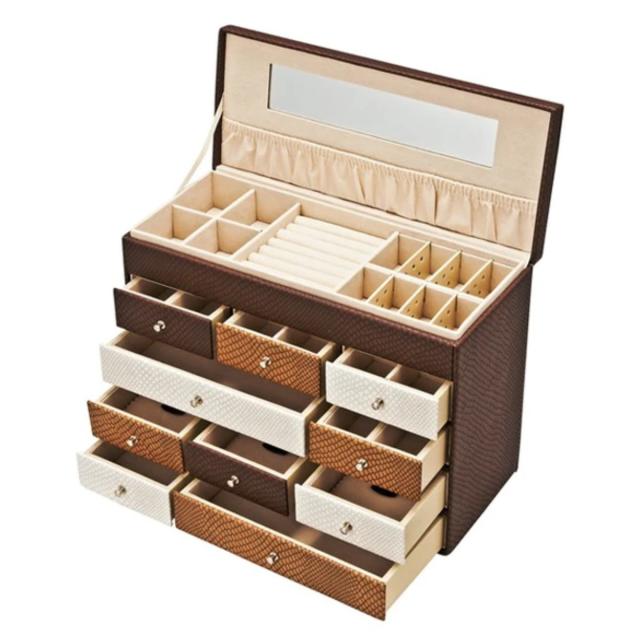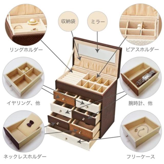 高級感のある素材を使用した、上品なたたずまいのジュエリーボックスです。引き出しがたくさんあり使いやすく、プレゼントにもおすすめです。