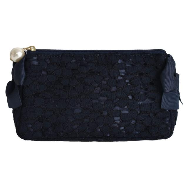 ポーチ レディース 小さめ フラワーレース リボン パール 花柄 おしゃれ かわいい 化粧 旅行 小物入れ 04.ネイビー