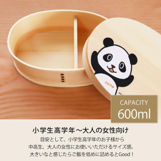大きいなと思ったらご飯を低めに詰めてください。お弁当箱 白木 漆塗り 600ml 小判型 弁当箱 1段 わかぱん 和歌山 ぱんだ パンダ 曲げわっぱ弁当箱 ランチボックス かわいい おしゃれ イラスト オリジナル 男子 女子 大人 子供 女の子 男の子 おしゃれ 木製 送料無料