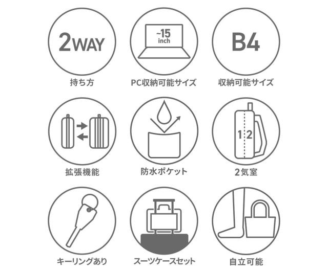 | 仕様 | <外側> マグネットポケット(L)×1 └ 内蔵 ポケット(XS)×1 ポケット(L)×1 ジップポケット(L)×1 └ 内蔵 ポケット(M)×1 ジップポケット(M)×1 └ 内蔵 ジップポケット(M)×1 ポケット(XS)×1 キーフック×1 ジップポケット(M)×1 └ 内蔵 ポケット(XXS)×2 ジップポケット(S)×1 <前面収納> PC収納×1 ポケット(S)×3 カードポケット×3 ペンホルダー×2 <背面収納> タブレット収納×1 ジップポケット(L)×1 仕切り×2 <付属品> ショルダーストラップ×1 PCケース×1 ネームタグ×1 |