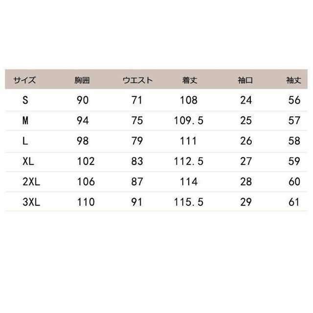 2XL:バスト106 ウェスト87 総長114 袖口28 袖長60
