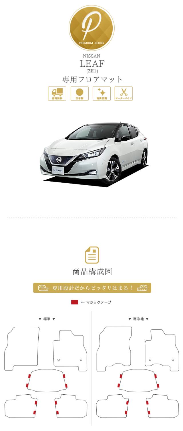 | 適合車種 | LEAF リーフ 年式 :2017(平成29)年10月〜2025(令和7)年10月 形式 : ZE1 ※全グレードに対応しております。 |