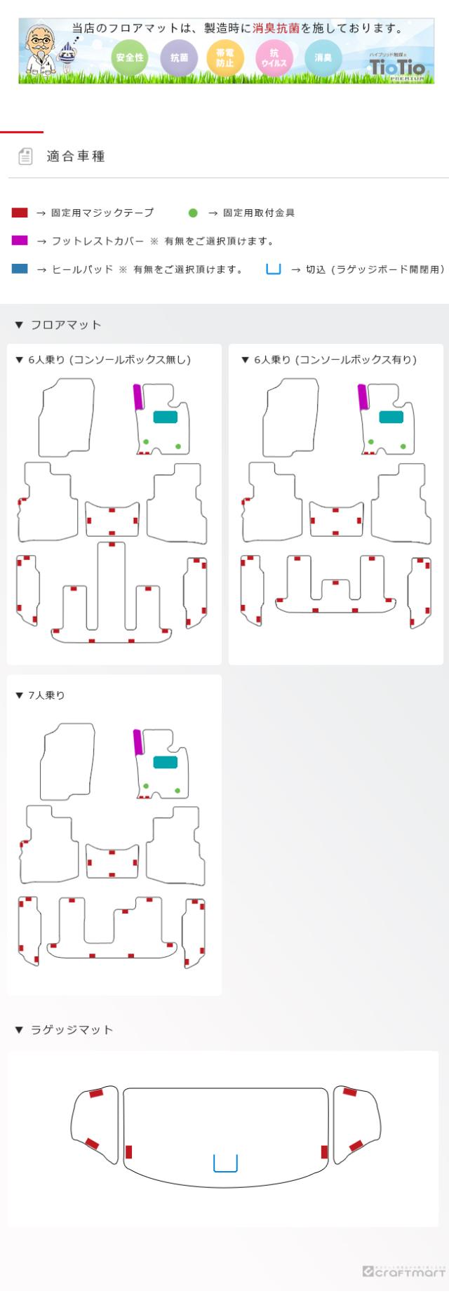 | 商品構成 | 運転席 1枚 助手席 1枚 セカンドシート 3枚 サードシート 3枚 ラゲッジマット 3枚 |