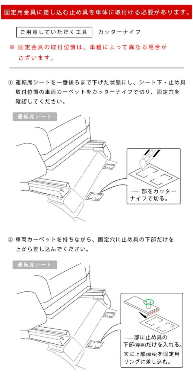 | 商品構成 | 【専用フロアマットSET】 Craft Martオリジナル型 ※ フローリングフロア車には適合致しません。 ※ 運転席フロアマットの固定金具は同梱しております。 ※ 当店専用固定金具ですので、純正固定具には対応しておりません。 |