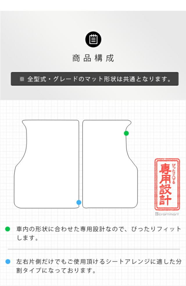 | 商品構成 | 専用ラゲッジマット 2枚 ※ 全型式・グレードのマット形状は共通となります。 ※ 車いす仕様車・サイドリフトアップシート車には適合致しません。 |