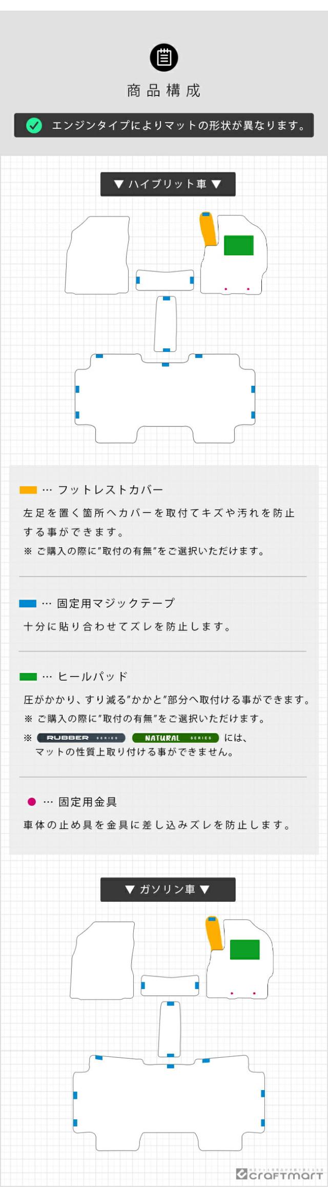 | 適合車種 | トヨタ シエンタ 年式:2022(令和4)年8月〜現行モデル 形式:MXPC10G MXPL10G MXPL15G ※エンジンタイプによりマットの形状が異なります。ご購入の際は、適合するタイプをご選択くださいませ。 |