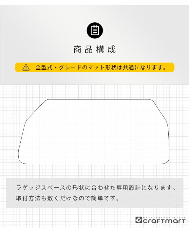 | 商品構成 | 専用ラゲッジアンダーマット 1枚 ※ 全型式・グレードのマット形状は共通となります。 ※ 車いす仕様車・サイドリフトアップシート車には適合致しません。 |