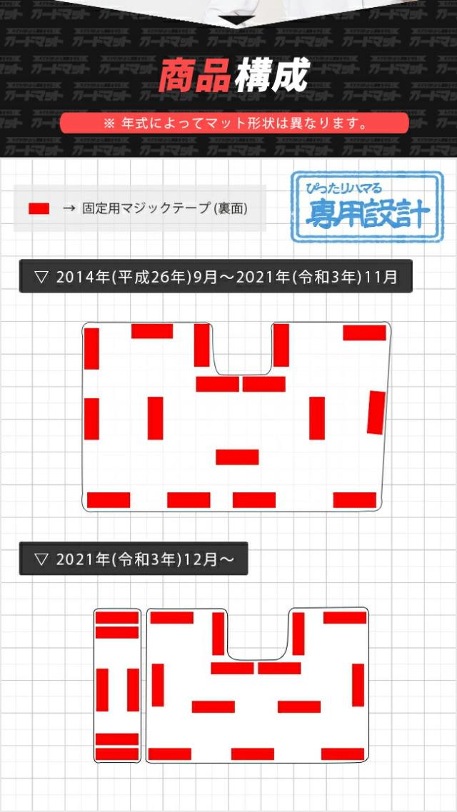 | 適合年式 | ・マイナーチェンジ(MC)後:2021年12月〜 ・マイナーチェンジ(MC)前:2014年9月〜2021年11月 ※ 年式によりマット形状が異なります。 |