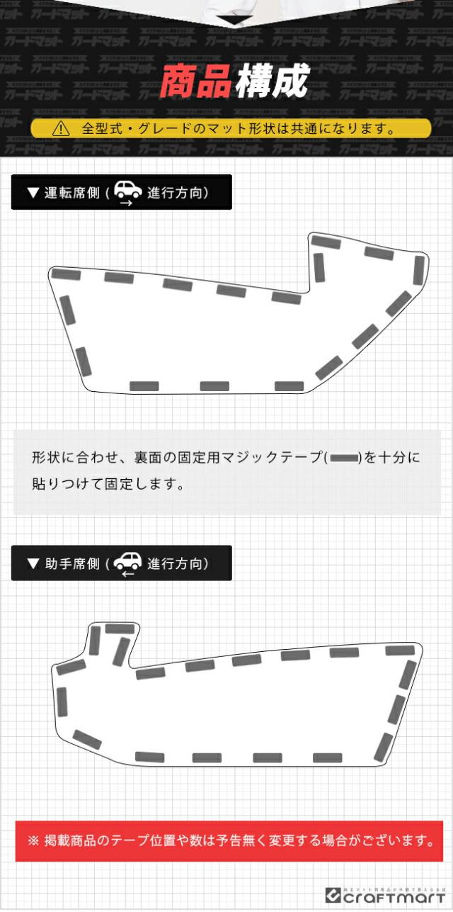 | 商品構成 | 大型コンソールボックス付き フロントパネル内側用ガードマット 2枚 |
