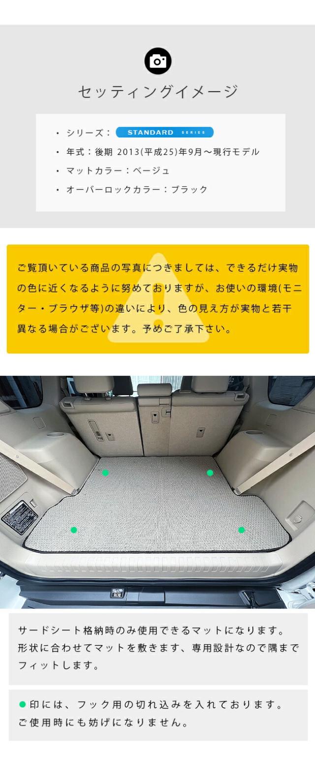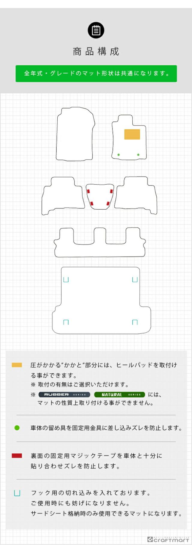 | 商品構成 | ・専用フロアマット 6枚 ┗ 運転席用 1枚 ┗ 助手席用 1枚 ┗ セカンドシート用 3枚 ┗ サードシート用 1枚 ・専用ラゲッジマット 1枚 ※ 全型式・グレードのマット形状は共通になります。 |
