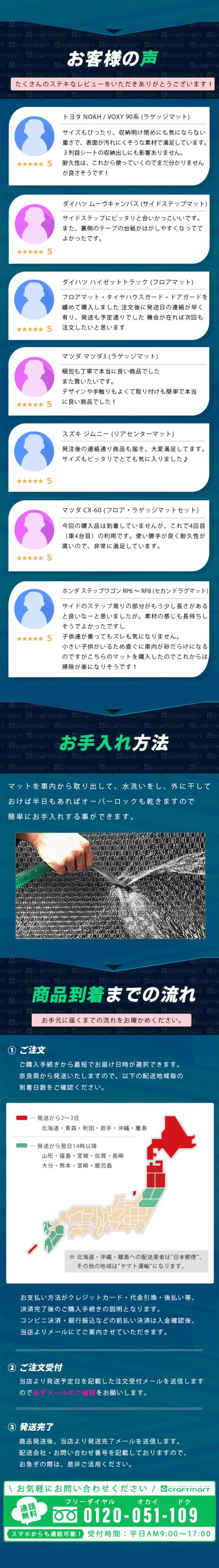 | 商品構成 | ▼専用フロアマット 5枚 ┗ 運転席 1枚 ┗ 助手席 1枚 ┗ 後部座席 3枚 |