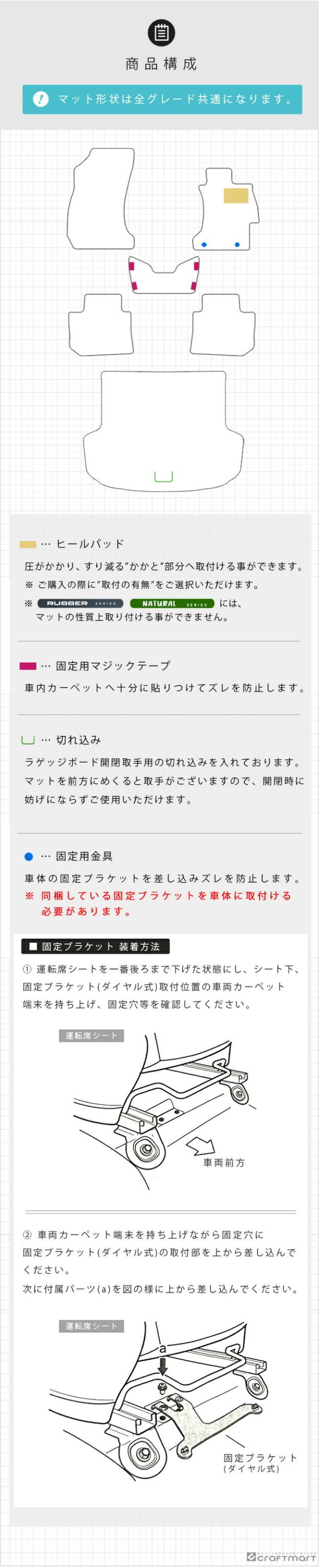 | 商品構成 | 専用フロアマット5枚(運転席 1枚 助手席 1枚 後部座席 3枚) 専用ラゲッジマット1枚 |