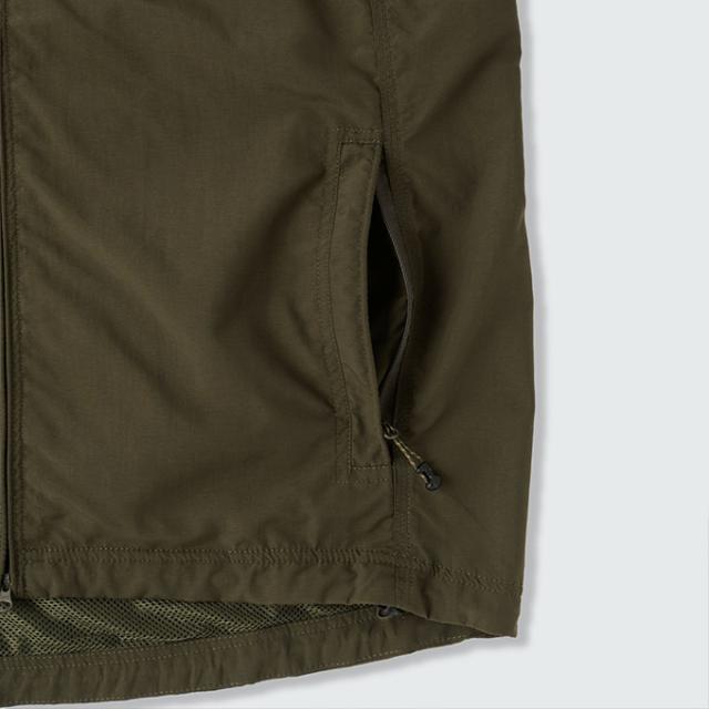 軽量かつコンパクトな素材で、ナイロンならではの高い繊維強度、防風性はそのままに、シワになりにくい優れた弾力回復性も備える。