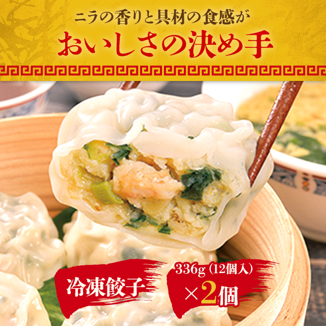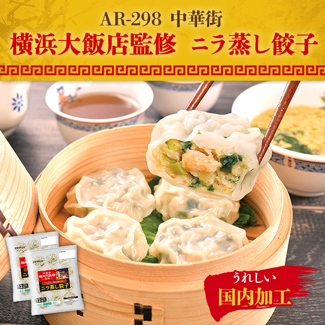 商品名 AR-298 中華街 横浜大飯店監修 ニラ蒸し餃子 2個セット 容量 336g(12個入)×2個 原材料名 小麦粉(国内製造)、にら、えび、豚肉、豚脂、水くわい、鶏肉、玉ねぎ、パン粉、粒状大豆たん白、食用油脂、調製ラード、砂糖、食塩、水あめ、オイスターソース、チキンパウダー、大豆粉、香辛料、粉末状小麦たん白 / 加工デンプン、調味料(アミノ酸等)、pH調整剤、グリシン、キシロース、香料、着色料(カラメル、カロチノイド)、乳化剤、リゾチーム、炭酸塩(K、Na)、重曹、(一部にえび・小麦・卵・乳成分・ごま・大豆・鶏肉・豚肉を含む) アレルギー特定原材料 えび・小麦・卵・乳成分 加工地 日本 賞味期限 出荷日から30日 保存方法 冷凍(-15℃以下)