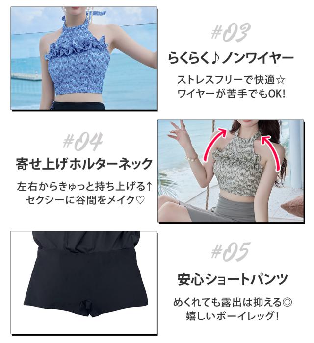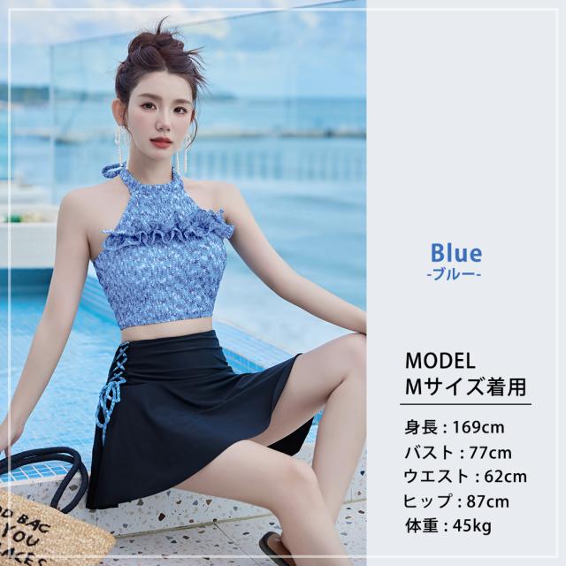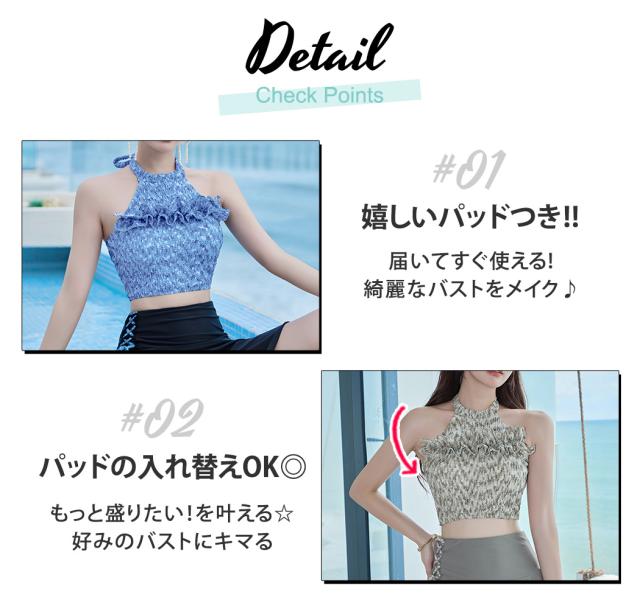 冬新作 水着 ビキニ ハイネック 体型カバー フリル フレアスカート レディース 2点セット シャーリング風 ホルターネック 肩ひも調節 ハイウエスト サイド レースアップ ワンポイント ミックスマッチ ノンワイヤー