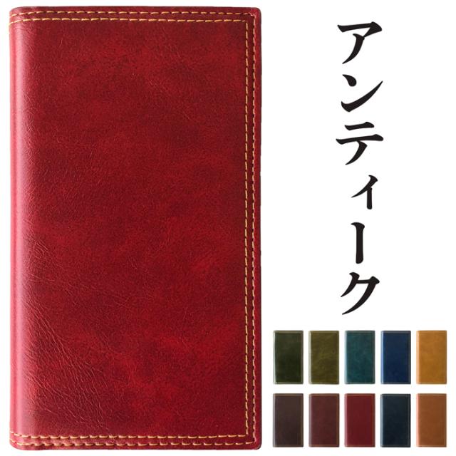落ち着いた色合いのアンティーク感あるPUレザーを全面に使用した手帳型ケースです。