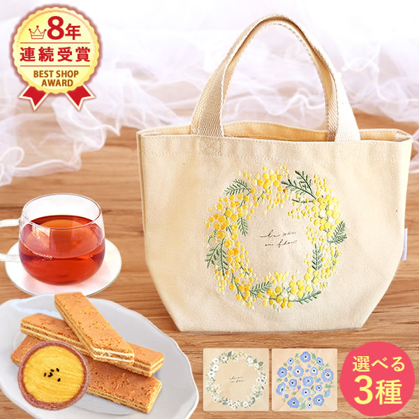 誕生日プレゼント お祝い 送料無料 お菓子 スイーツ 洋菓子 雑貨 トートバッグ ミニトートバッグ 刺繍 ミモザ あじさい ネモフィラ 北欧 ナチュラル メール便 おいもや