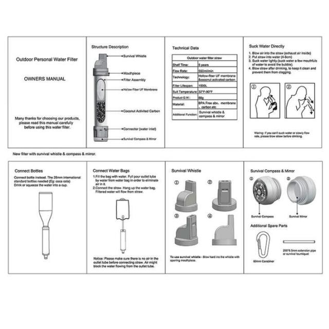 【シンプルな操作】:携帯浄水器は小さくて軽量でさらに持ち運びに大変便利です。ボトル/飲みポーチを接続して、水を直接飲むことができます。または、ストローで飲み物を飲むように浄水器で水を吸い上げます。飲み終わったらストローに息を吹き込んで、汚れや残った水を取り除いてから保管してください。
