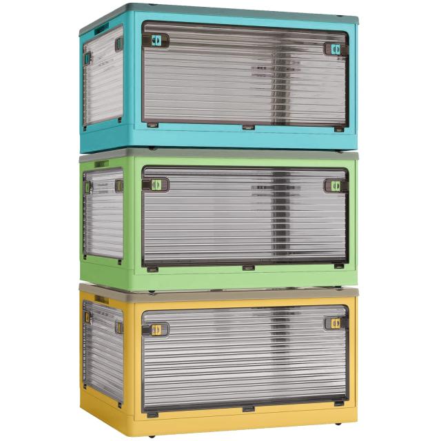 【折り畳み?上に蓋/側面扉付き】収納箱界の大革新!使わない時に折りたたんで収納できます。スペースを取りません。側面四面も扉付き、収納にとても便利です。上にふた付き、物を入れやすい。蓋をロックできます。物を取るは側面扉から、ボックスを積み重ねる状態にも楽に物を取り出して、伝統的な収納ボックスに比べてもっと便利で、機能性が向上します。