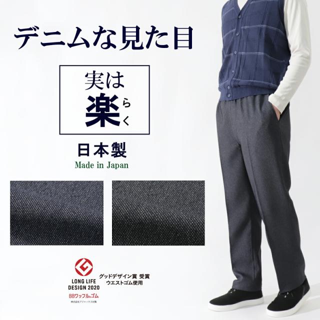 シニアファッション 父の日 おすすめ ギフト プレゼント メンズ 高齢者 服 春 秋 【品番5107】 70代 80代 スラックス ウエストゴム 総ゴム M L LL 男性 サラサラ デニム調 ズボン 股下65cm 紳士 日本製