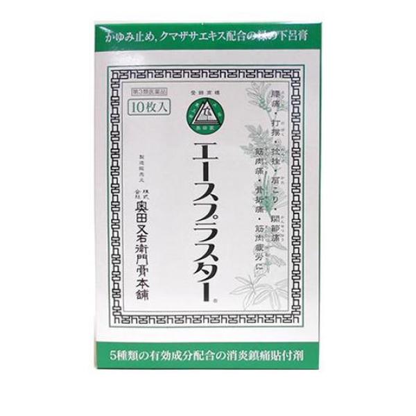 緑の下呂膏として親しまれるエースプラスターは生薬配合の貼り薬で,肩・腰・関節等腫れた症状(急性症状)が見られる患部を直接治療いたします。また,和紙を採用していますので,患部を適度に固定し,痛みを和らげます。痒み止めの抗ヒスタミン剤の他,メントールや天然熊笹エキスを配合した清涼感のあるさわやかな製品です。