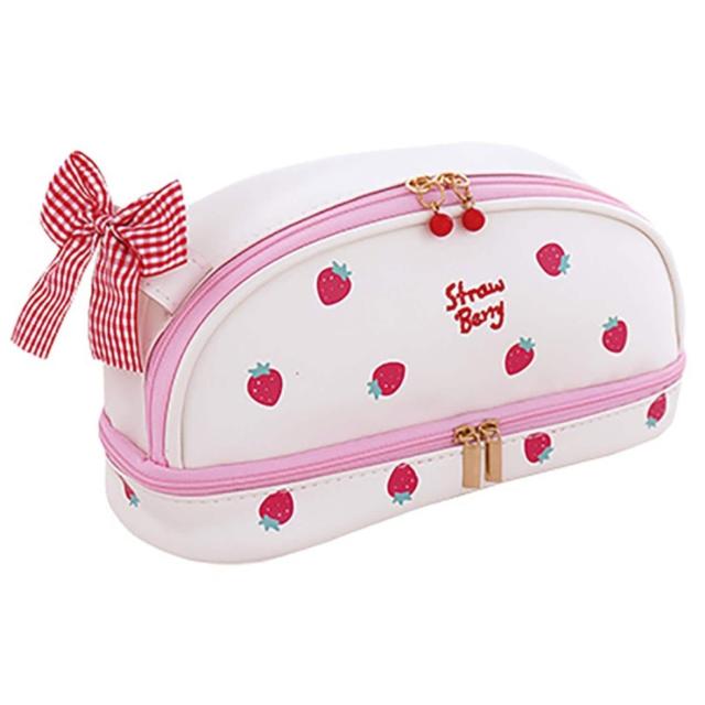 白色 チェックリボン付きいちご柄大容量ペンポーチ