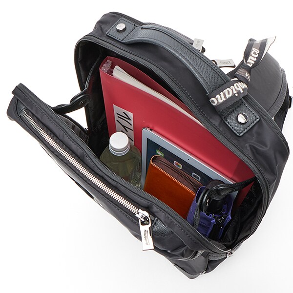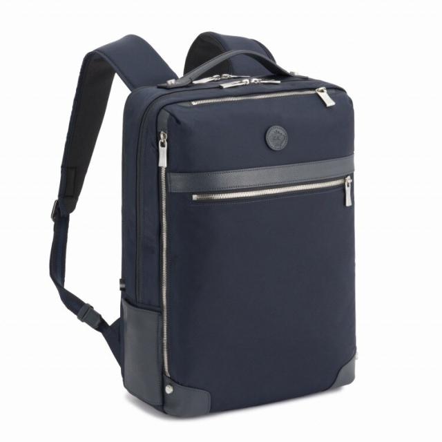 スクエアフォルムのスッキリとしたデザインで、A4サイズの書類やPCもすっきりと整理して収納することができるビジネスシーンでも活躍するリュックサック。