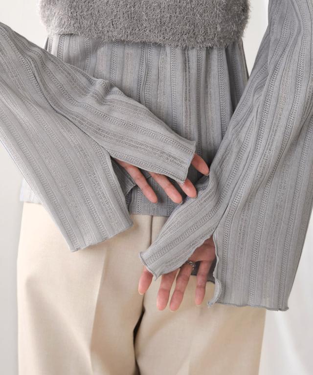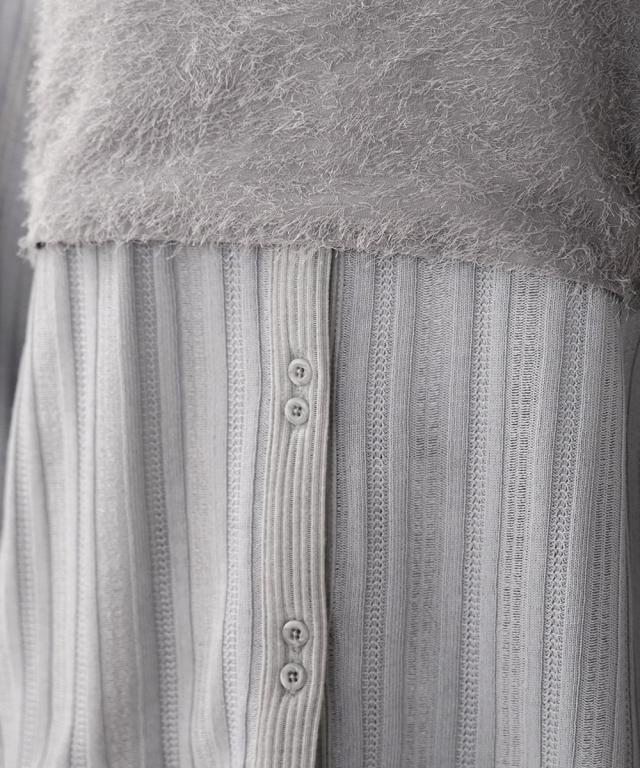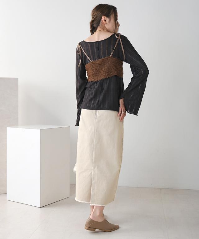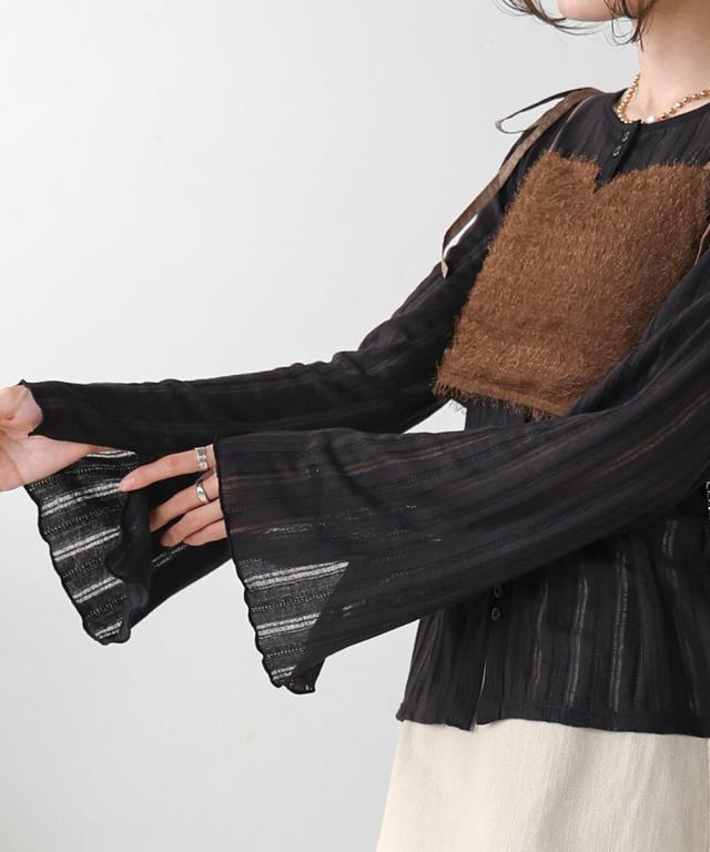 繊細なストライプ模様が浮き出たシアー感のあるカーディガントップスと、コーディネートのアクセントになるシャギービスチェのトレンド感溢れるセットアイテムです。トップスはフロントのボタンが2連になった特徴のあるデザインで前後2WAYでも着用いただけます。フレアスリーブにスリットを入れることで抜け感を出しました。メロウ始末で女性らしさも際立ちます。ビスチェは肩紐を結んで着丈を自由に変えて頂ける仕様に。後ろがギャザーゴムになっているので、窮屈さもなく柔らかい着心地です。もちろん単品使いや それぞれ別のアイテムでもコーディネートを楽しめる着こなしの幅が広がる1着です。