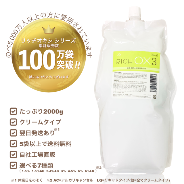 リッチ オキシ3% 2000ml (5袋以上送料無料,初回限定お試し価格,12袋迄購入可,高品質低価格,業務用オキシ,染毛剤,ヘアカラー2剤,OX3,自社工場直販)