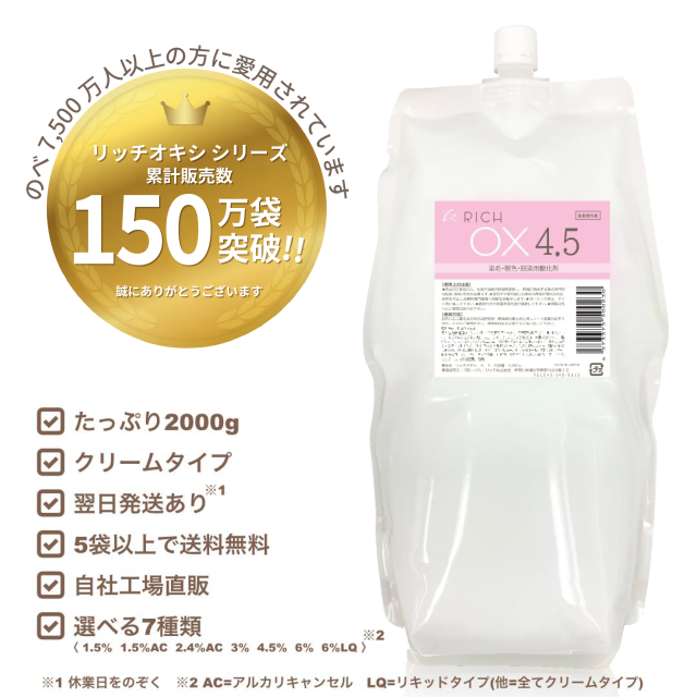 リッチ オキシ4.5% 2000ml(5袋以上送料無料,初回限定お試し価格,12袋迄購入可,高品質低価格,業務用オキシ,染毛剤,ヘアカラー2剤,OX4.5,自社工場直販)