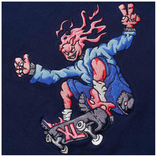 フロントはスケーターのオリジナルグラフィックを刺繍でレイアウト。