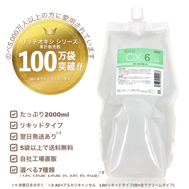 リッチ オキシ6%LQ 2000ml リキッドタイプ(初回限定お試し価格,12袋迄購入可,5袋以上送料無料,高品質低価格,染毛剤,ヘアカラー2剤,自社工場直販)