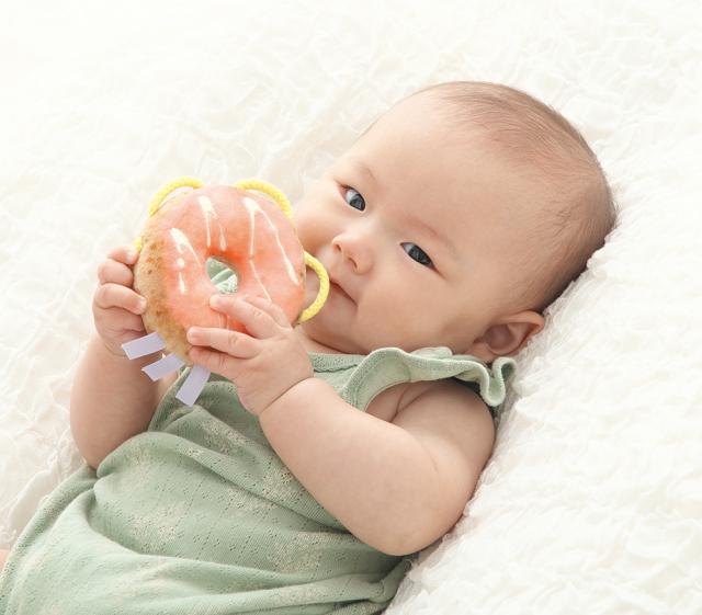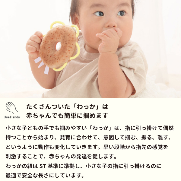 本物そっくりなラトルの周りには、月齢の低い赤ちゃんの小さな手でも持ちやすいように、わっかをつけました。