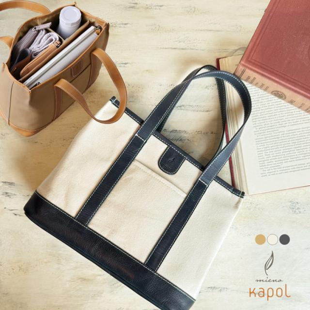 仕切り トートバッグ レディース ミニトート バッグ 小さめ 軽量 mieno ファスナー付き 収納 キャンバス 帆布 牛革 レザー