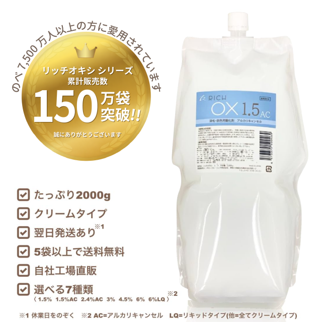リッチ オキシ1.5%AC 2000ml (5袋以上送料無料,初回限定お試し価格,12袋迄購入可,高品質低価格,業務用オキシ,染毛剤,ヘアカラー2剤,OX1.5AC,自社工場直販)