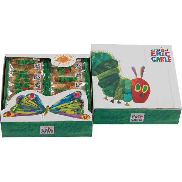 絵本「はらぺこあおむし」をモチーフにした「ひねり揚げ」のギフトボックスです、絵本をイメージしたポップアップな派tケージです。