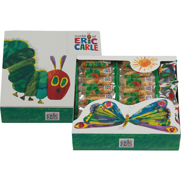 絵本「はらぺこあおむし」をモチーフにした「ひねり揚げ」のギフトボックスです、絵本をイメージしたポップアップな派tケージです。