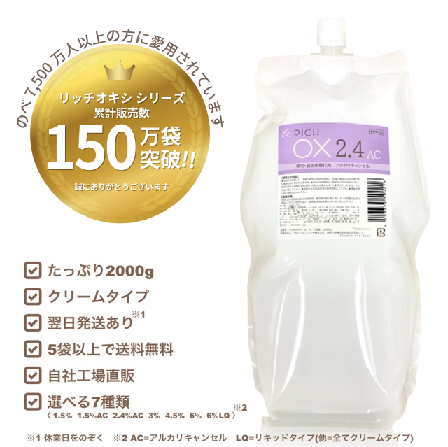 リッチ オキシ2.4%AC 2000ml(5袋以上送料無料,初回限定お試し価格,12袋迄購入可,高品質,業務用オキシ,染毛剤,ヘアカラー2剤,自社工場直販)