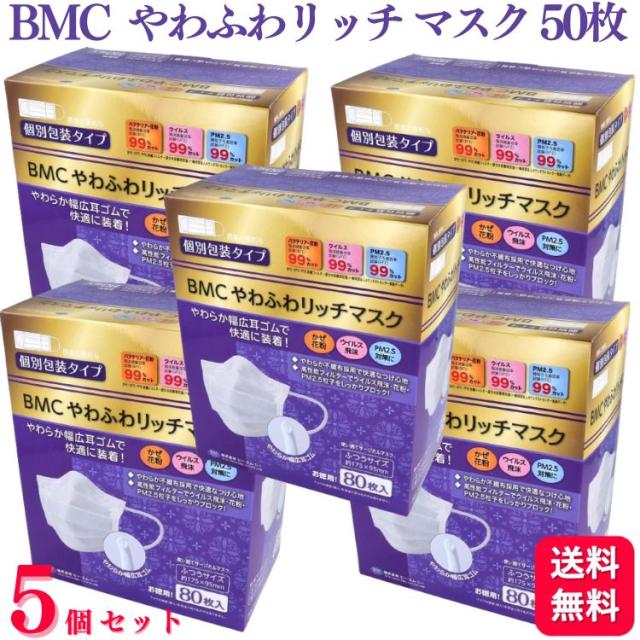 【送料無料】【5個セット】 BMC やわふわリッチマスク ふつう ホワイト 80枚入 やわふわマスク 快適マスク BMC サージカルマスク ビーエムシー 医療用 サイズ マスク 3層構造 白 使い捨て 耳痛くなりにくい 息しやすい 幅広ゴム 大人用 マスク 対策 レギュラーサイズ 不織布マスク ウイルスカット PM2.5 花粉 風邪 対応 送料無料 VFE・BFE・PFE PM