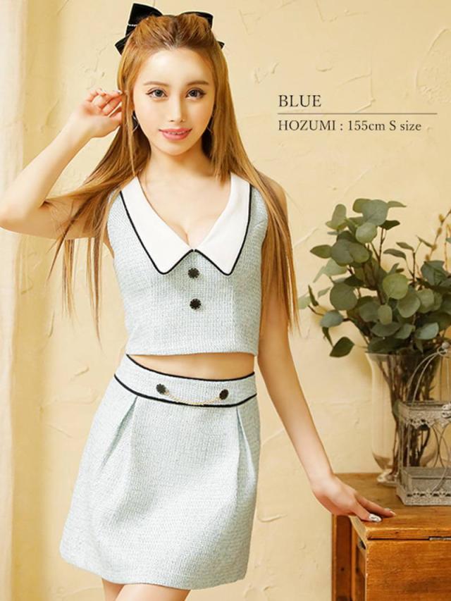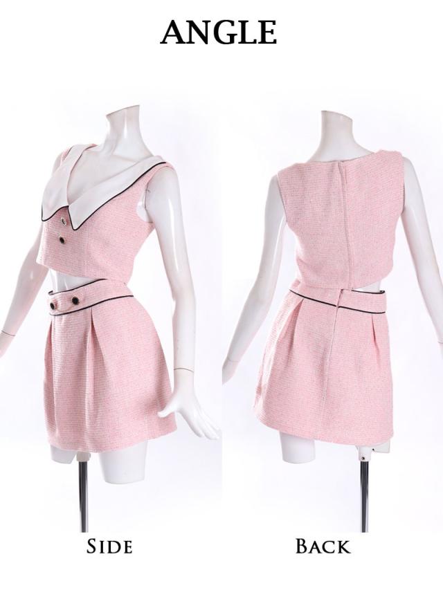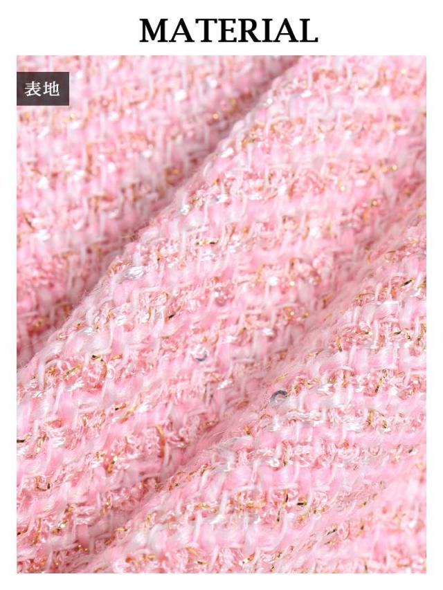 ☆華やかなピンクと水色のツイードドレスはパイピングデザインでメリハリBODYを演出するセットアップドレス。