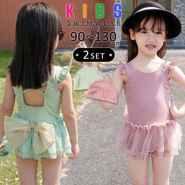 冬新作 キッズ 水着 女の子 ワンピース オールインワン スイムキャップ 2点セット 肩フリル フリルショルダー シアー ティアード チュール スカート バックリボン バッククロス ショーツ一体型 裏地あり 日焼け対策 幼稚園 保育園 小学生 プール 水遊び