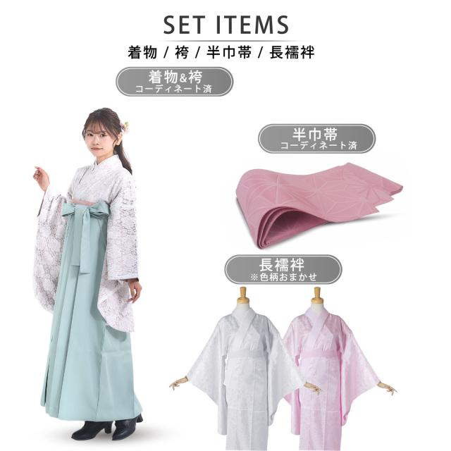 卒業式用の二尺袖着物、袴、半幅帯をコーディネートした安心の袴セットです。