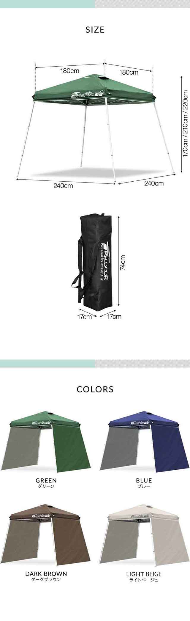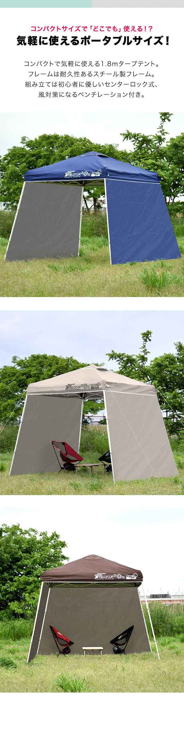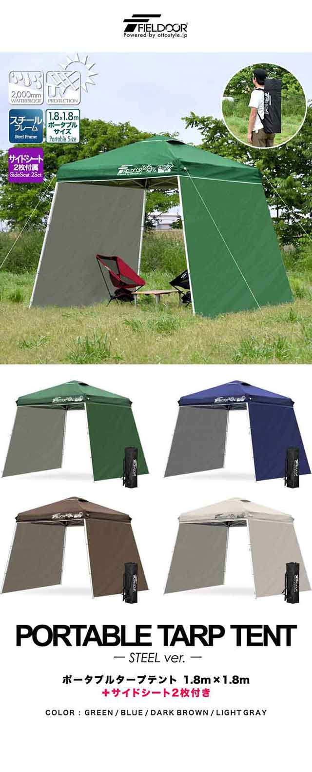 ポータブルタープ テント タープ サイドシート2枚付き 横幕セット 1.8m×1.8m 頑丈 スチール 180cm コンパクト 収納 小型 持ち運び 簡単 設営 ワンタッチタープ ワンタッチテント UV加工 撥水 ポータブルタープテント FIELDOOR 1年保証 送料無料