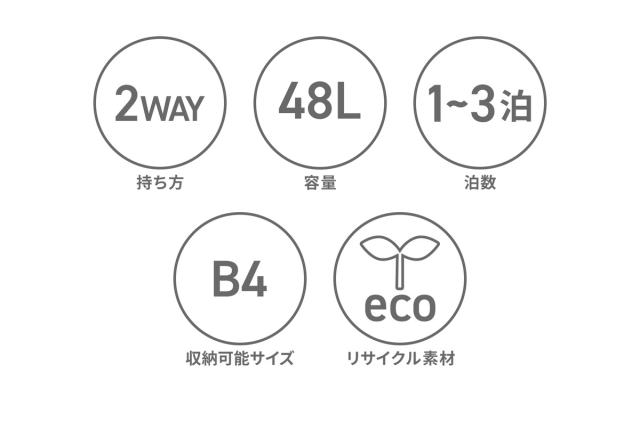シンプルかつスポーティーなルックスで、老若男女問わずに使える2WAYボストンバッグ。ショルダーストラップとハンドルの使い分けができる、汎用性の高いデザインです。収納部は48Lの容量を備え、1〜3泊程度の旅行や合宿に最適なサイズ感。内装に吊りポケットを1つ設けているので、小物類の管理に役立ちます。また、外側にもポケットを配置し、サッと取り出したいアイテムの収納に便利なつくりになっています。