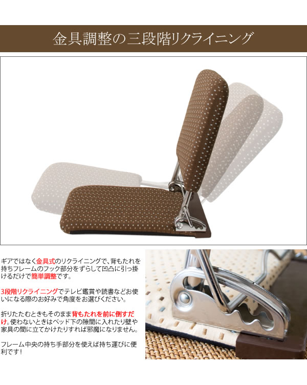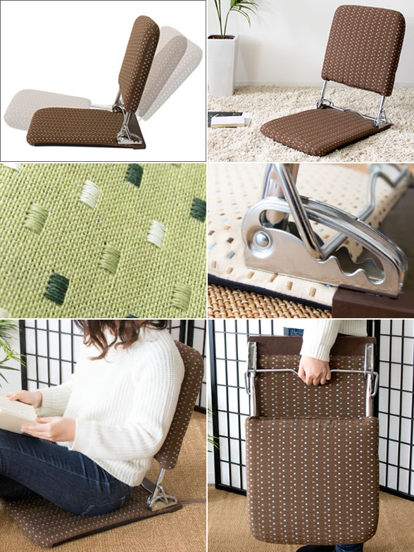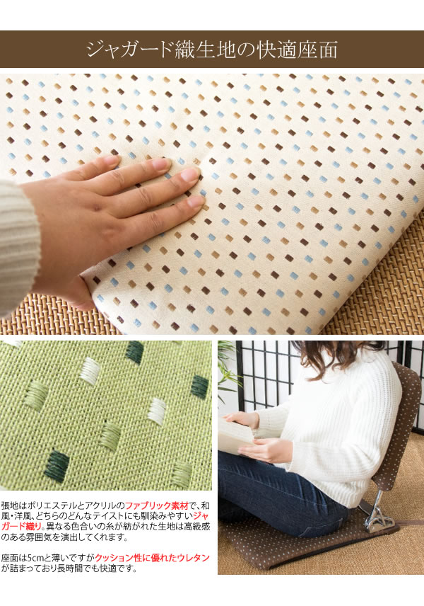 座椅子 薄型 折りたたみ 完成品 日本製 国産 リクライニング おしゃれ 和モダン 軽量 コンパクト 頑丈 丈夫 フロアチェア ジャガード織り ファブリック 幅40cm 奥行51〜73cm 高さ44〜53cm 座面高さ5cm 和室 洋室 リビング 一人暮らし シンプル ブラウン ベージュ グリーン