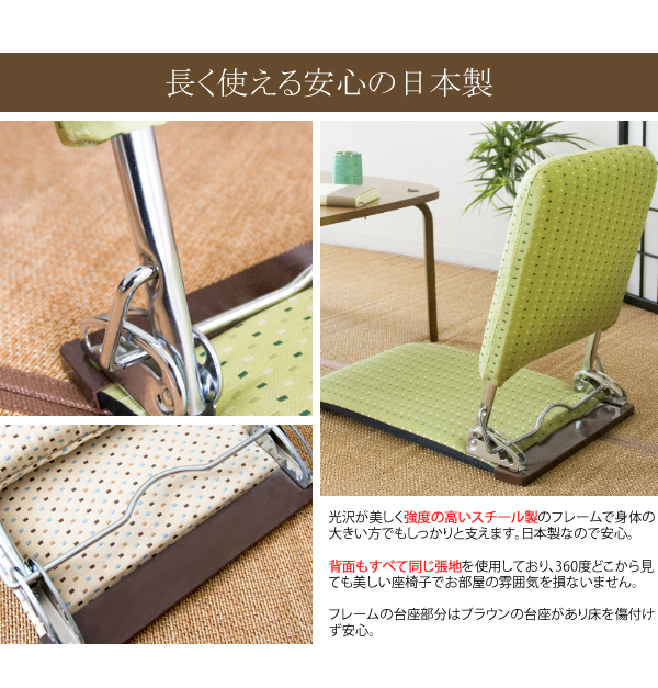 折りたたみ式で移動ラクラクな軽量座椅子。薄型ですが、安心の日本製フレームを使用しているので、丈夫で快適にお使いいただけます。