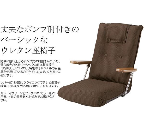 簡単に跳ね上がるポンプ式の肘置きがついた、落ち着きのあるベーシックな日本製座椅子。