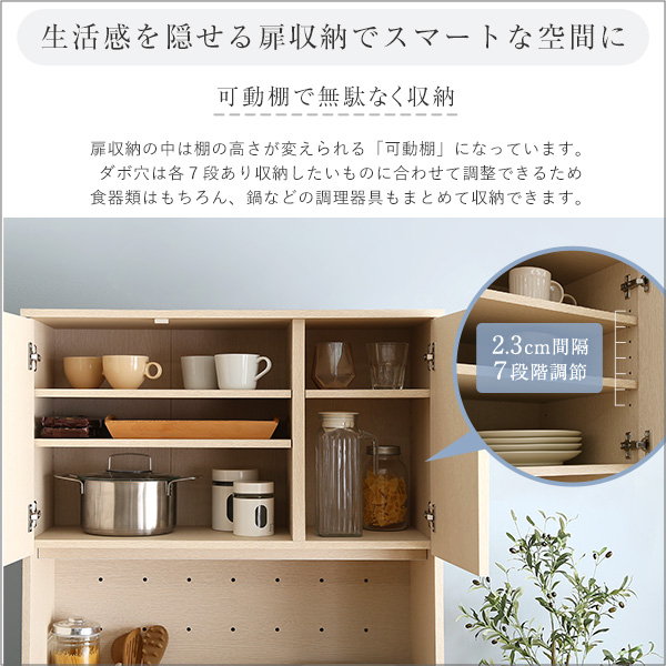 ●戸棚内の棚板は可動棚で収納物に合わせて高さ調節が可能です。食器や調味料、調理器具の収納ラックにも